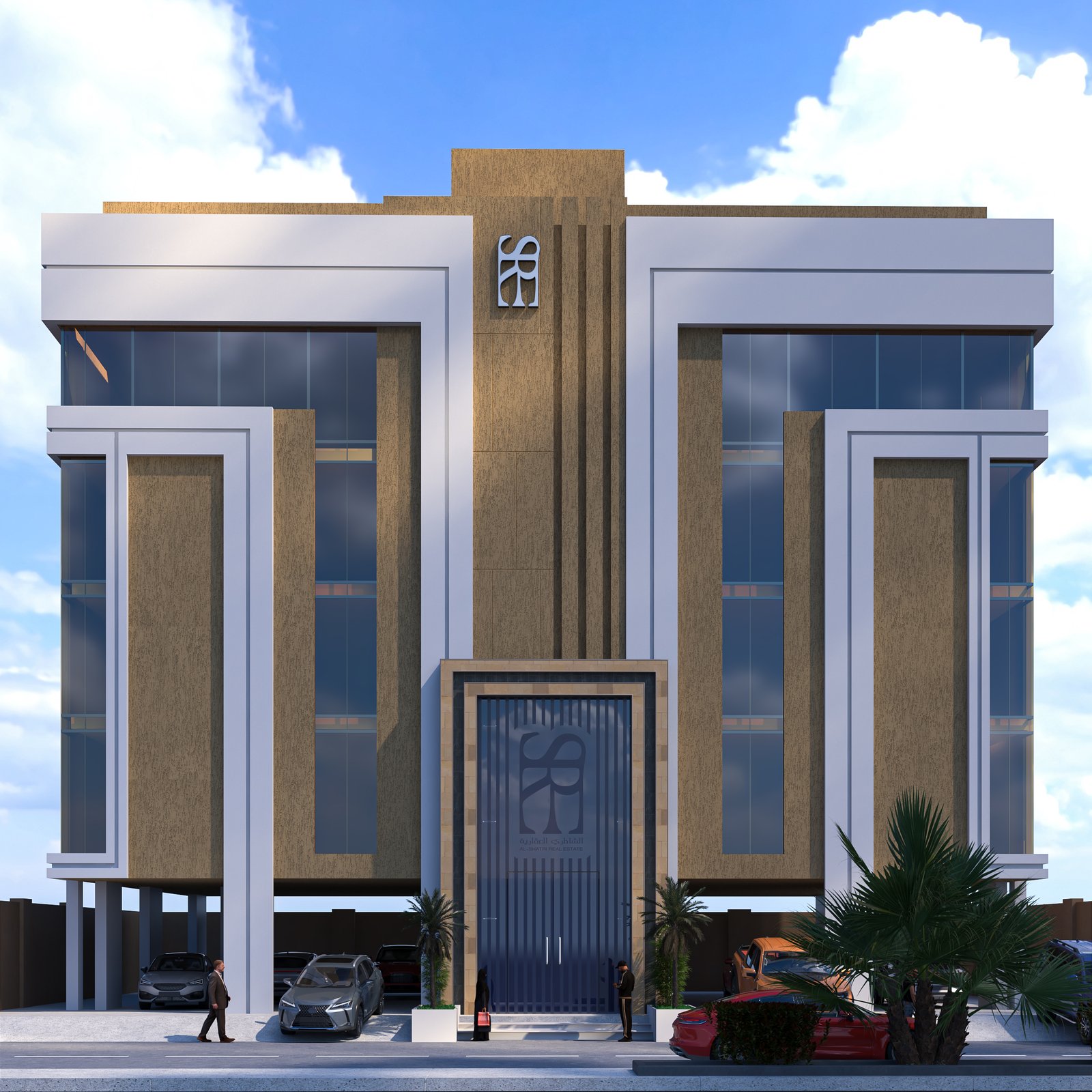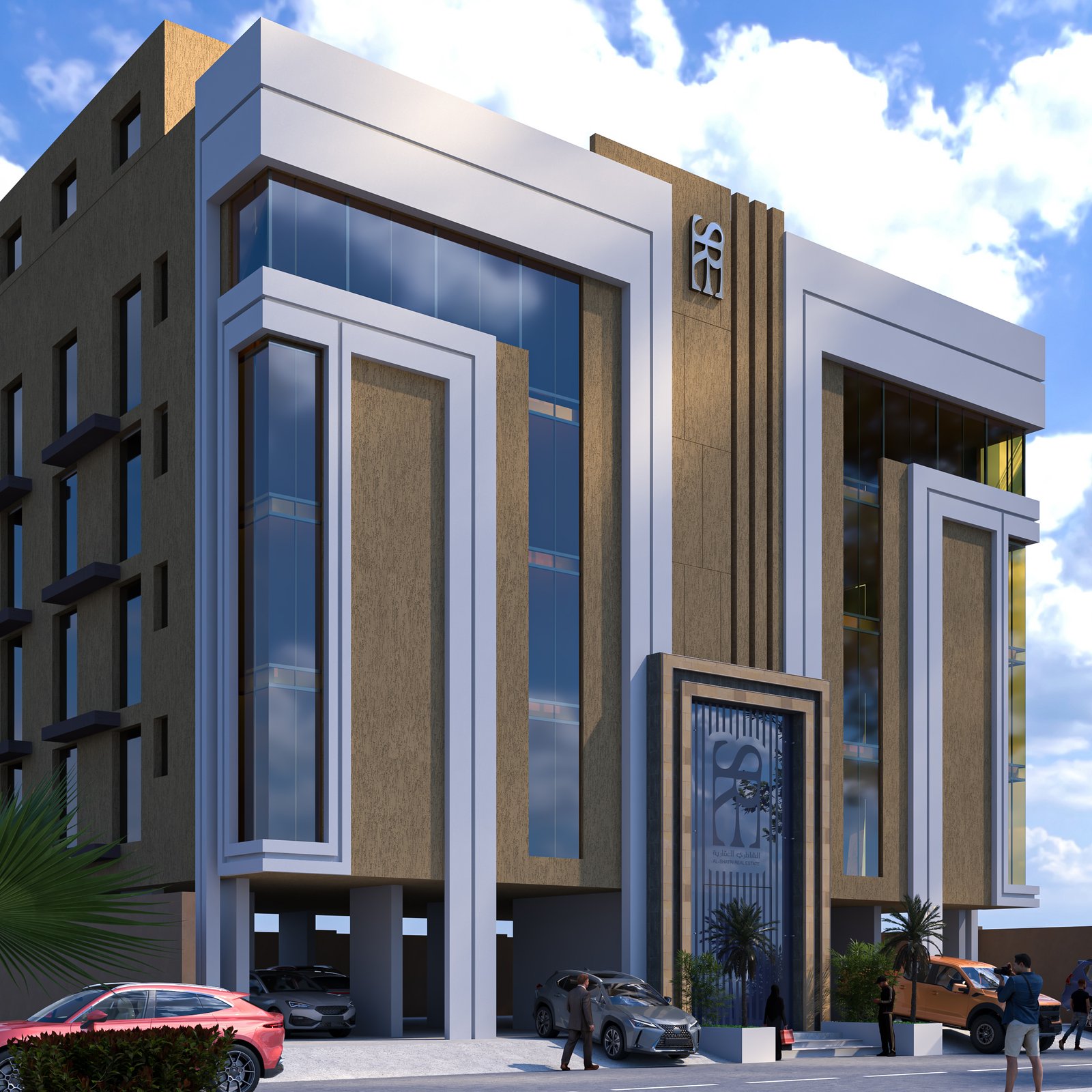 تم الاتفاق على الألوان من هوية الشركة وهي درجات البيج والأبيض والازرق بالشبابيك باختلاف أنواع مواد التشطيب مع مراعاة الاتجاهات المطلة على الشمال والشرق وكذلك مراعاة أماكن التكييف المنفصل على الشقق الجانبية بحيث لا تؤدي لاختلاف كبير في التصميم.