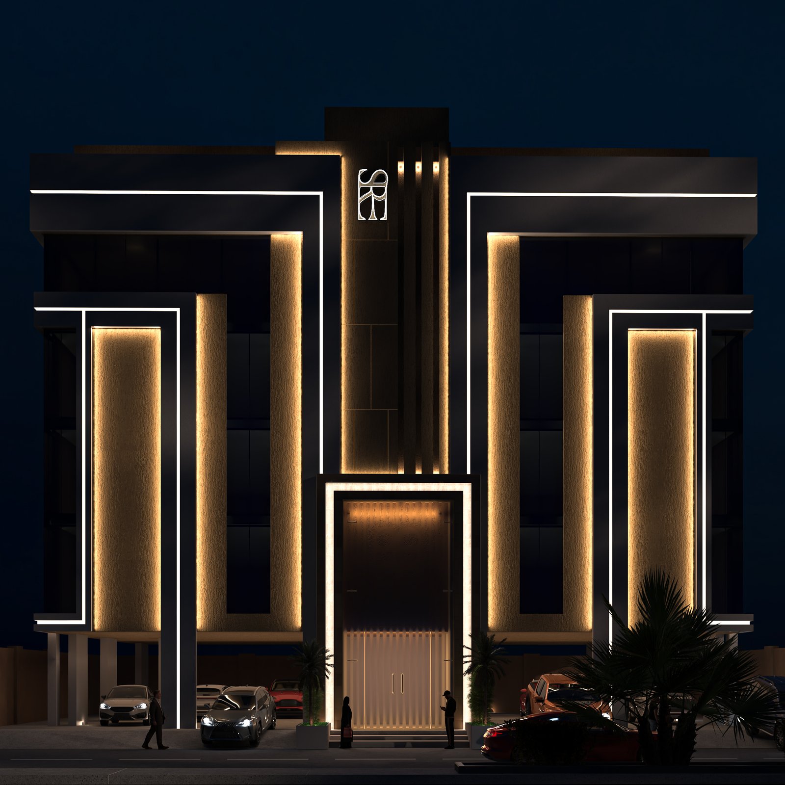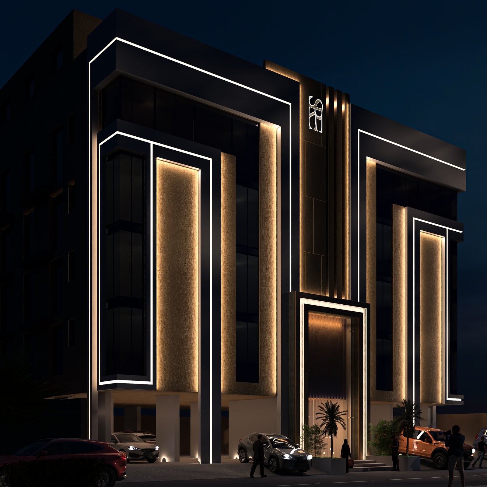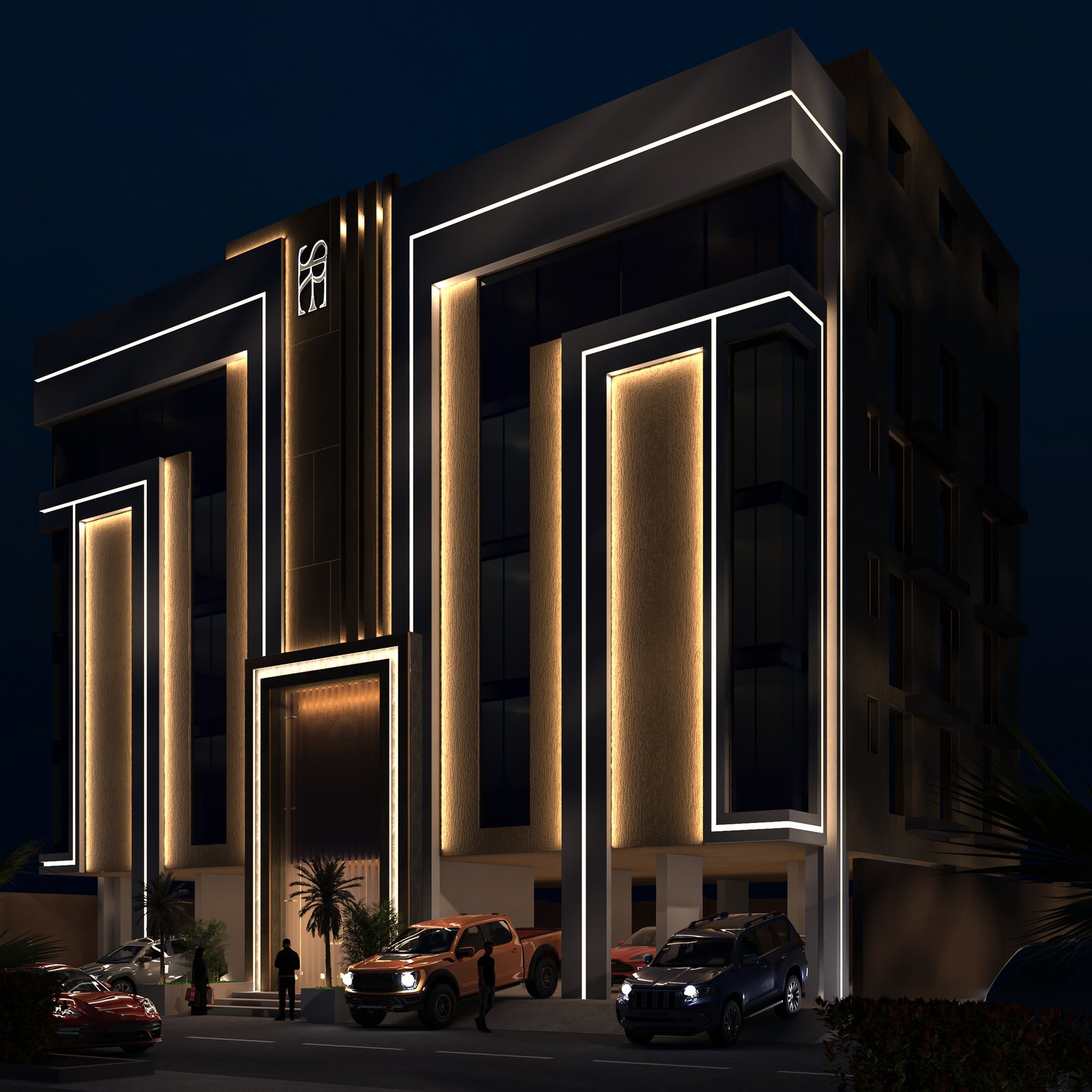 وكذلك التصميم الليلي الذي يوضح أماكن تركيب الاضاءات بأنواعها وبالأماكن المؤثرة بحيث توضح التصميم بشكل جمالي مناسب للهوية ولطبيعة المشروع.